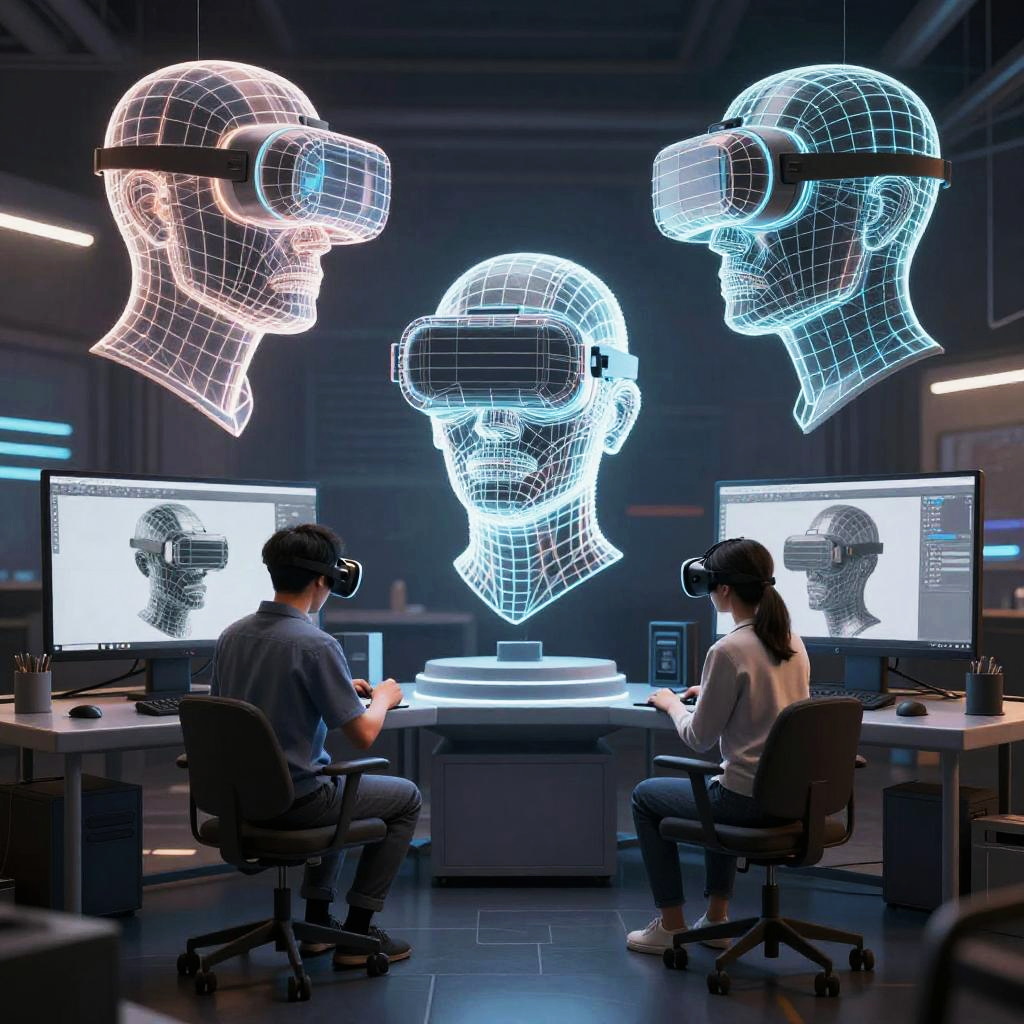 Image to 3D model online conversion, virtual reality environment with digital artists sculpting 3D objects generated from 2D images, glowing wireframe meshes floating around, immersive cyberpunk studio, advanced computer graphics, high detail polygonal modeling