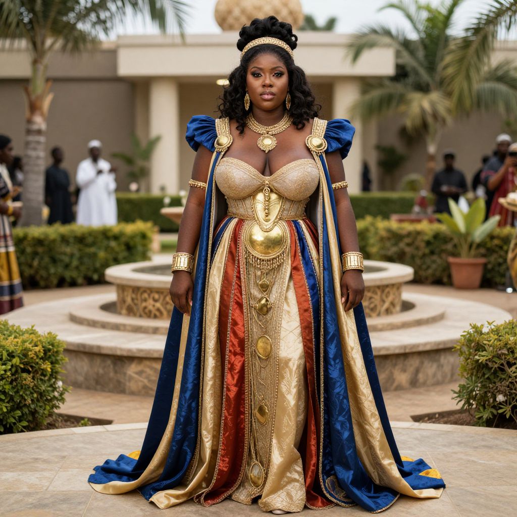 Photograph of a tall, dark-skinned African woman with curly black hair, wearing an elaborate, regal gown. The dress features a gold, low-cut bodice with intricate patterns, a red and gold skirt, and a blue velvet cape with gold trim. She has a gold necklace, armbands, and a headpiece. She stands confidently in a lush, tropical courtyard with palm trees and a circular stone fountain in the background. Several people in traditional African attire are visible in the blurred background, adding to the cultural ambiance. The overall style is opulent and royal.