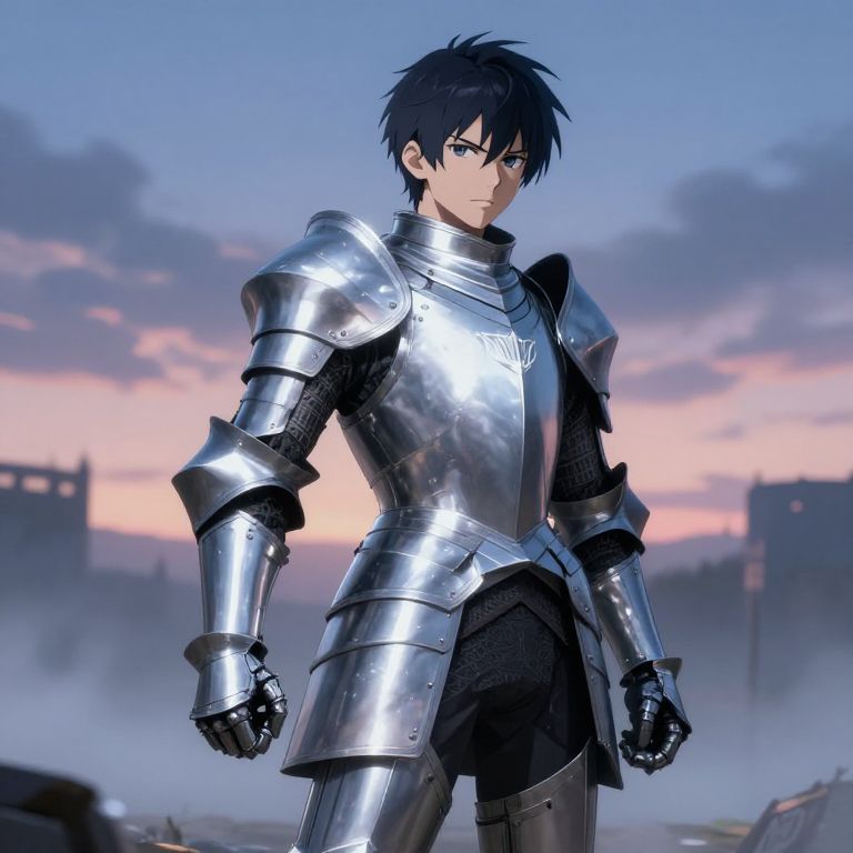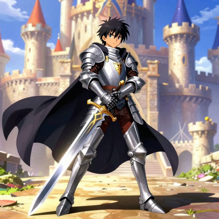 Anime boy knight in ornate medieval armor, gripping a glowing sword, long flowing cape fluttering, vibrant fantasy castle in the background, dramatic lighting and sharp shadows