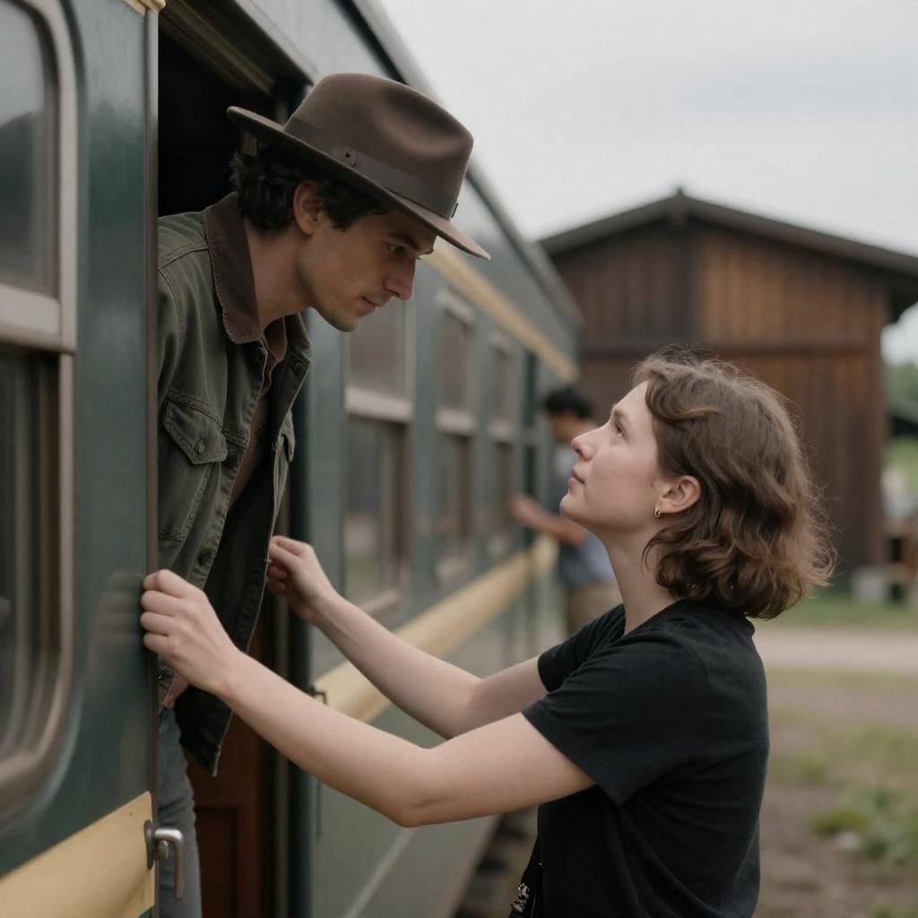 Photograph of a scene with a man in a brown hat and green jacket leaning over a train's door, hands on a woman's arms. Woman with short brown hair, black shirt, looking up. Train and wooden building in background. Another person visible inside train. Overcast sky.