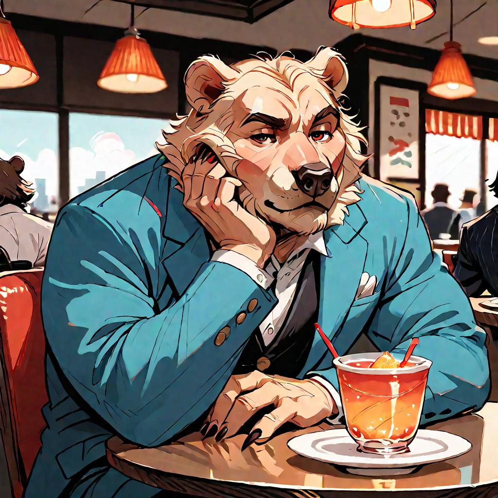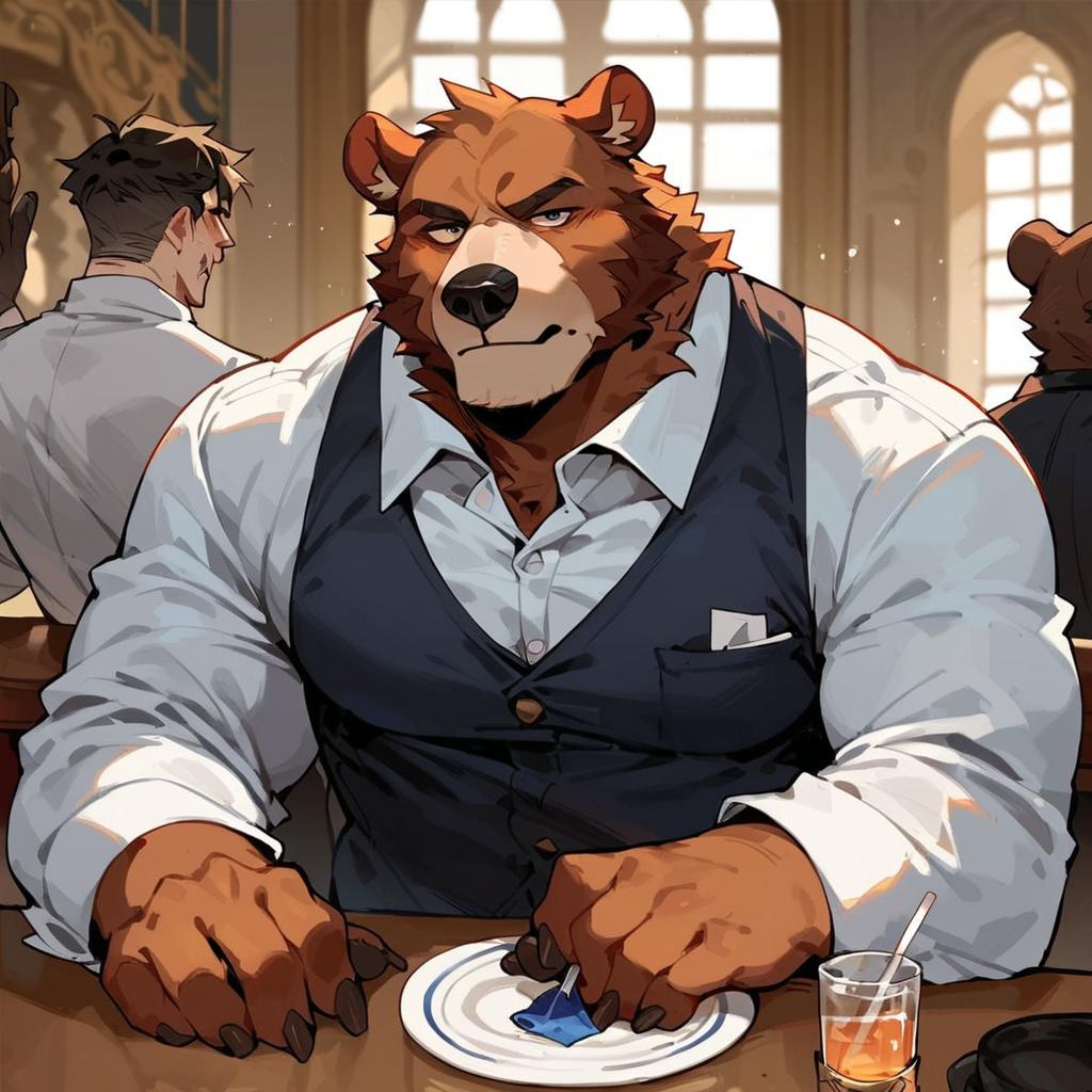 Score_9, score_8_up, score_7_up, score_6_up, score_5_up, score_4_up, source_furry, gentleman bear sit at a table at a cafe, bear, gentleman, solo focus, rating_safe