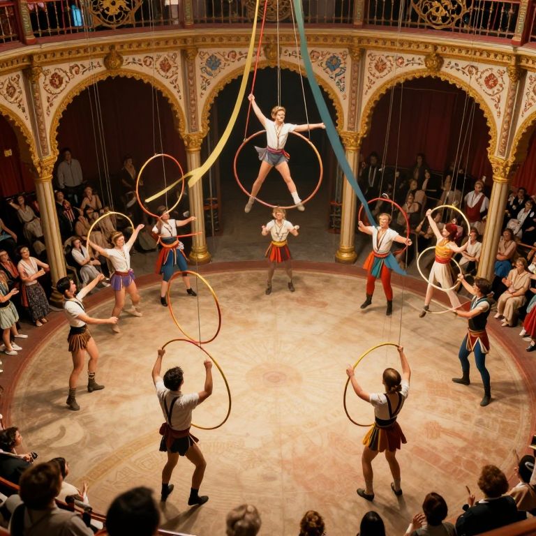 Photograph of a circus performance in an ornate, arched, indoor arena. A troupe of eight male and female acrobats, dressed in colorful, tight-fitting costumes with skirts and suspenders, perform hula hoop tricks. The central female acrobat, suspended mid-air by ropes, balances a hoop above her head. The audience, seated on tiered benches, watches intently. The floor is wooden, and the background features intricate gold and blue decorative arches. The performers' costumes include red, blue, yellow, and green hues, contrasting with the elegant, classical architecture. The image is brightly lit, highlighting the performers' dynamic movements and vibrant attire.