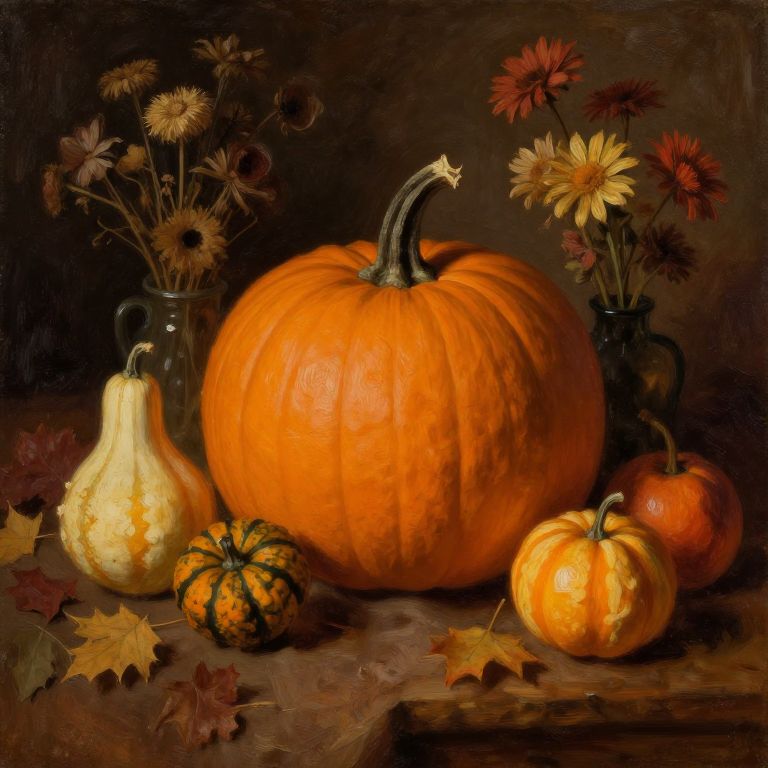 Vintage-style still life painting of a pumpkin surrounded by gourds, dried flowers, and autumn fruits, rich warm colors and textured brushstrokes, classical composition with moody lighting, cozy seasonal atmosphere
