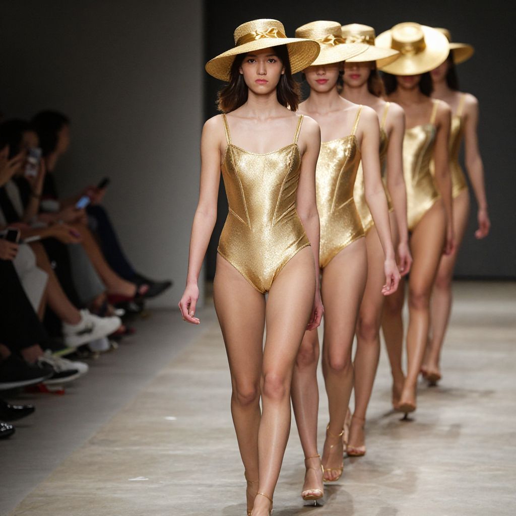 Photograph of five slender models walking a runway in gold metallic one-piece swimsuits and wide-brimmed gold hats, with audience in dim background.