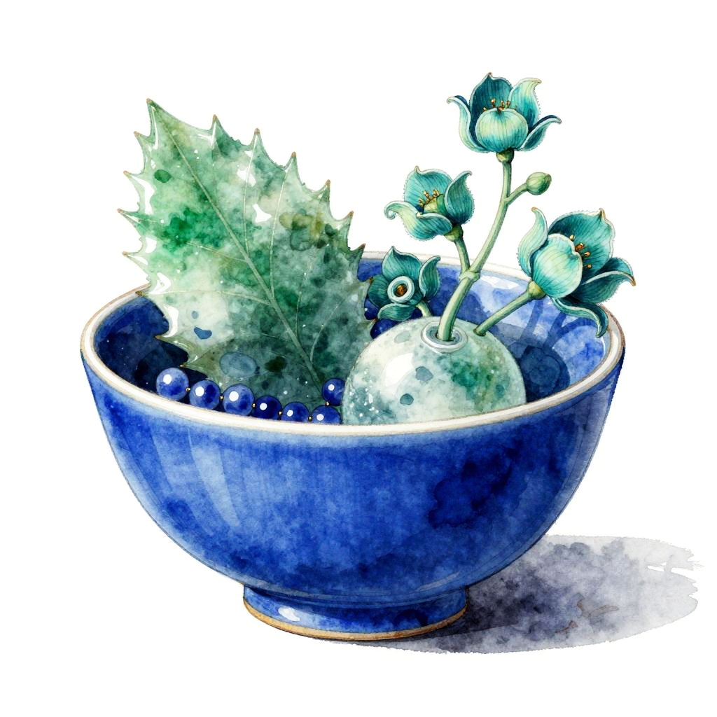 A contemporary still-life of a brushed cobalt ceramic bowl, filled with spiked jade leaves, curling teal blossoms, and small sapphire beads. Executed in ink-and-watercolor with bold shapes, crisp edges, matte–gloss contrast, and careful negative space. Clean white gallery backdrop, vivid blues and greens, high contrast, subtle paper grain, refined lighting, serene mood, editorial quality.