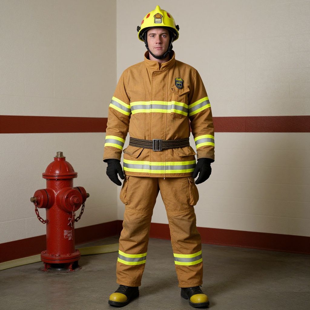 Month Firefighter Costume, firefighters are standing in a room with a fire hydrant and a fire hose