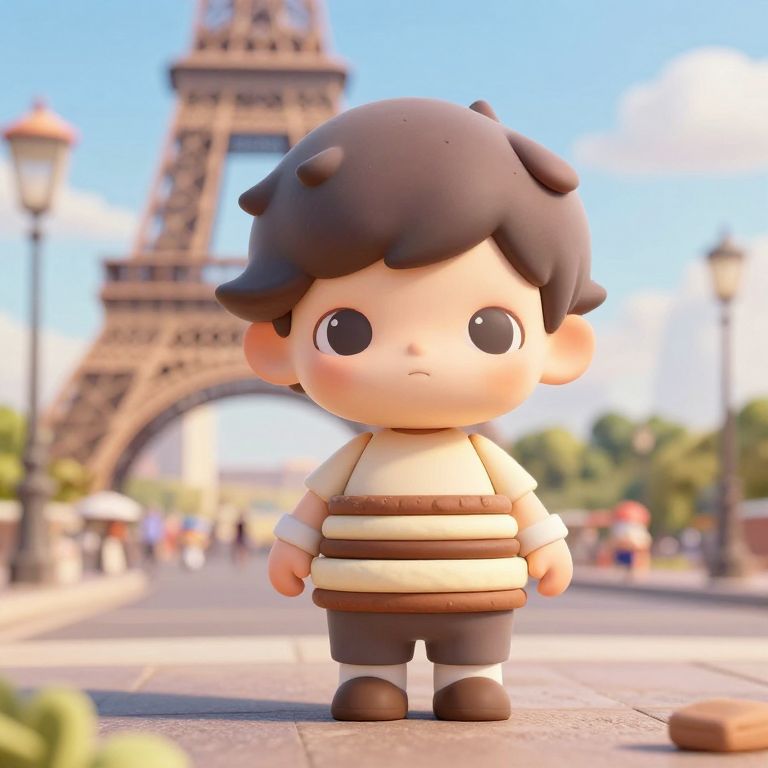 This is a digital CGI image featuring a cute, cartoon-style child with large, round black eyes and short, dark brown hair standing in front of the Eiffel Tower in Paris. The child wears a white and brown striped shirt with brown pants and brown shoes. The background is brightly lit with a clear blue sky, showing the iconic Eiffel Tower slightly out of focus and with blurred street lamps and people. The child's expression is neutral, and the scene is rendered with a soft, almost plush-like texture, giving a warm and inviting feel to the image.
