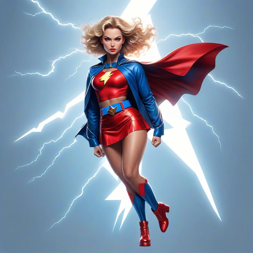 A confident woman dressed in a vibrant superhero costume featuring a red top with a yellow lightning bolt, a red pleated skirt, blue cape, and red high-heeled boots. She stands with hands on hips against a background illuminated by stylized blue and red lightning patterns on a starry backdrop.