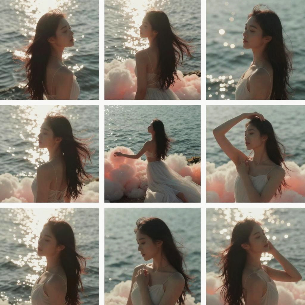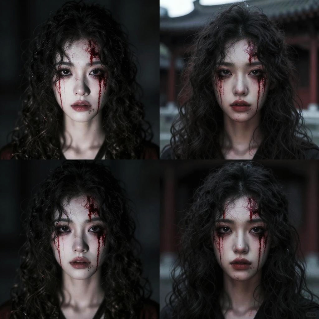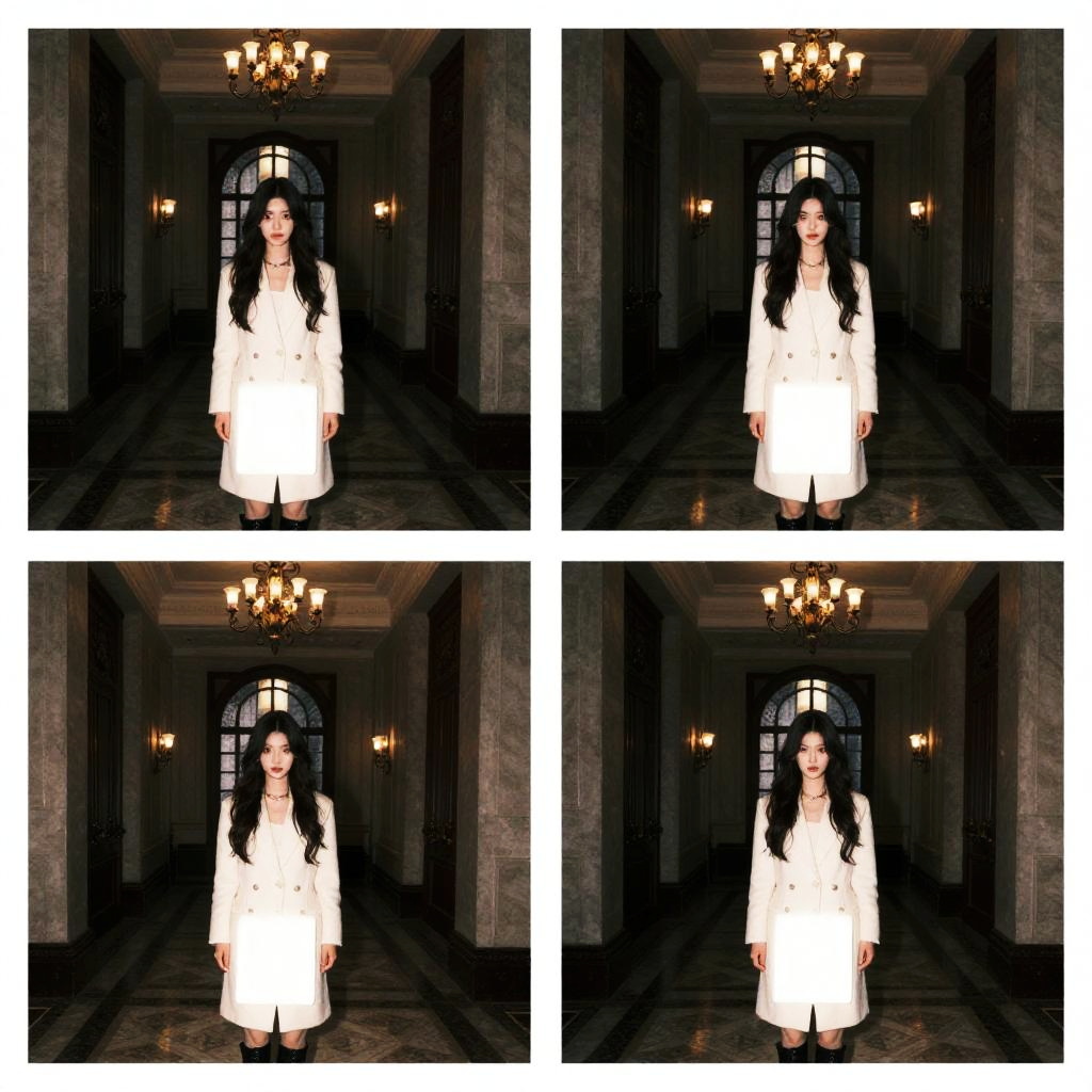 Photograph collage of four images showing a young woman with long black hair, pale skin, and dark eyes, standing in a dimly lit, ornate hallway with marble floors and arched windows. She wears a white, long-sleeved, buttoned-up coat that contrasts with the dark background. A chandelier hangs from the ceiling in each image. Her expression is neutral, and she stands centered in each frame. The hallway has stone columns and wall sconces, adding to the grand, old-world atmosphere. The images are arranged in a 2x2 grid.