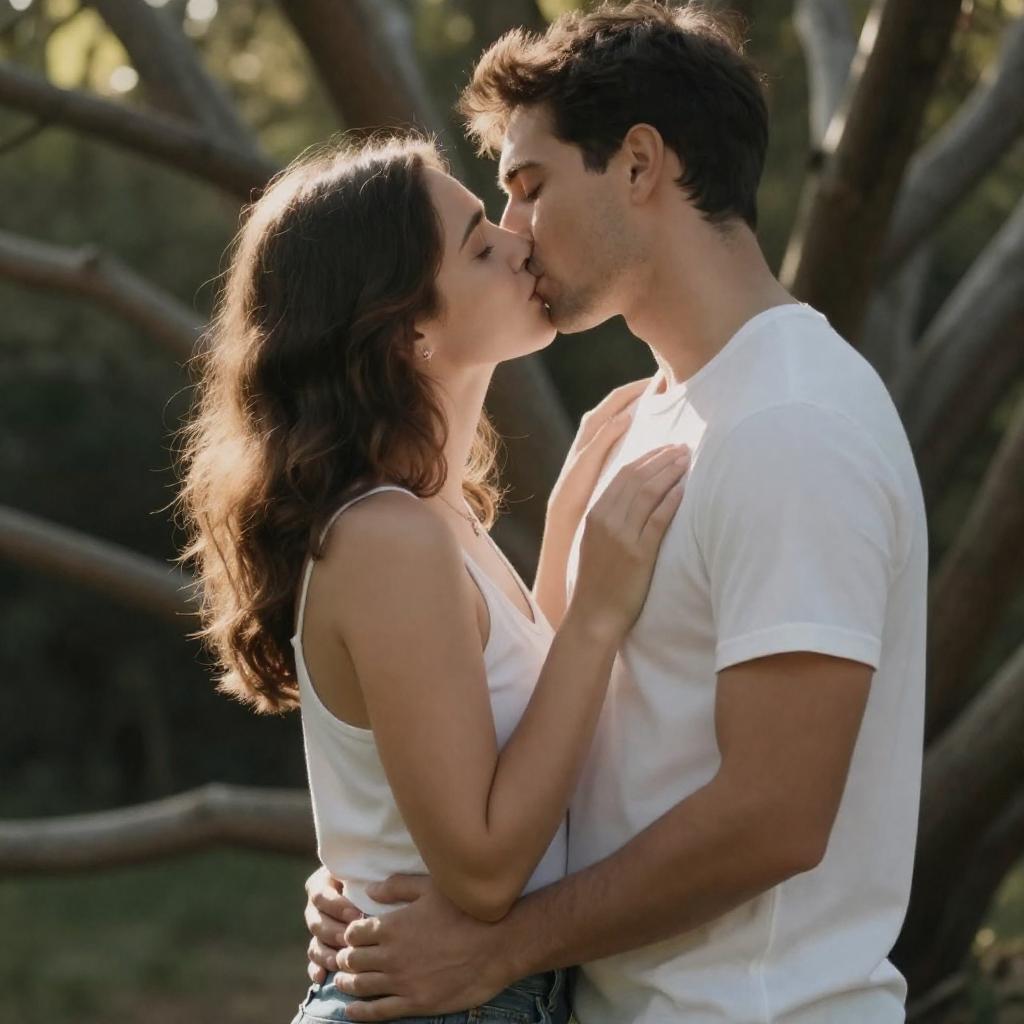 Shirtless Man and Woman Firelit Kiss