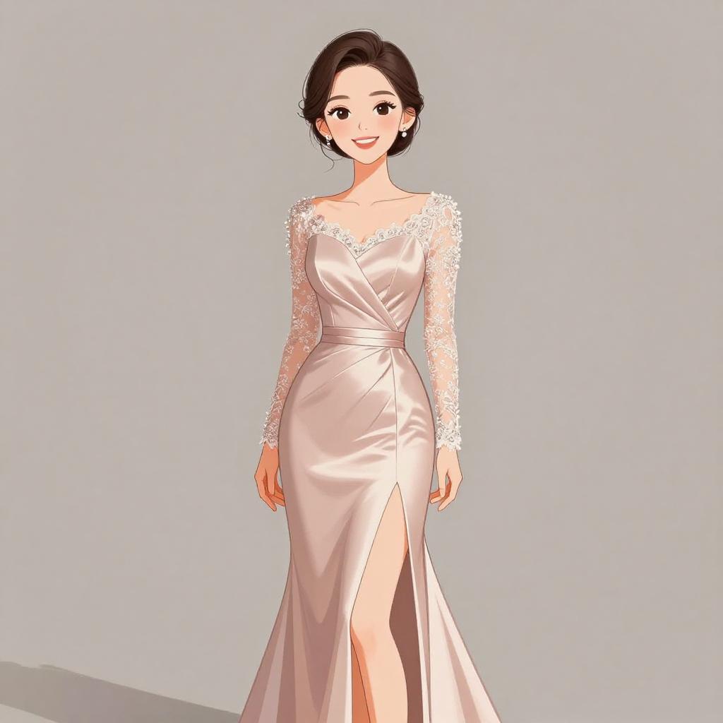Woman with pretty face and pretty hair. smiling Woman, sophisticated glamour, fitted mermaid gown in champagne satin, sheer illusion neckline, cap sleeves, intricate gold beading and embroidery on bodice, semi-sheer back with embellishments, curve-hugging silhouette flaring at the knee, elegant updo hairstyle, drop earrings, beige studio background --sref 1467