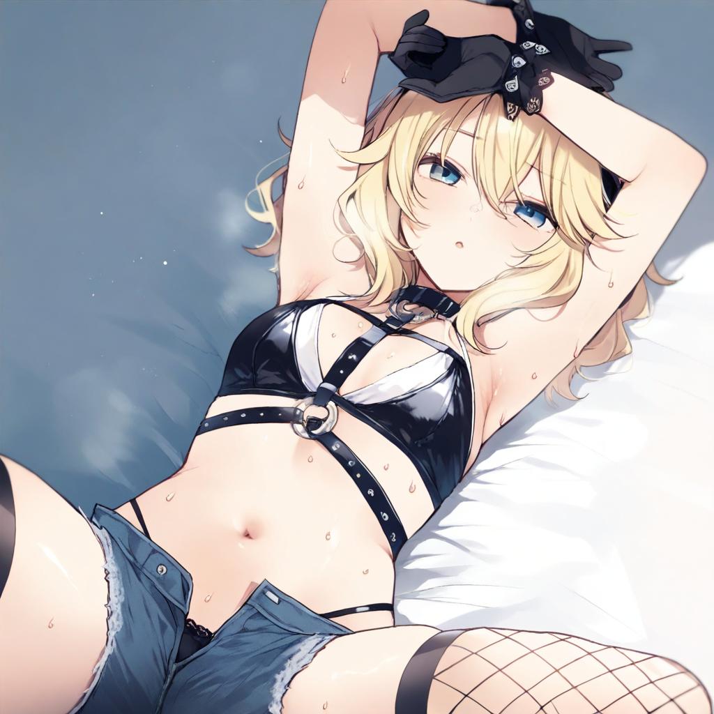 Close-up digital illustration of a blonde anime girl with blue eyes lying down with arms raised. She is wearing black and white lingerie with strap details, fingerless gloves, and fishnet stockings. Droplets of water on her skin give a fresh, dewy look. The background features a white pillow and soft blue bedding.