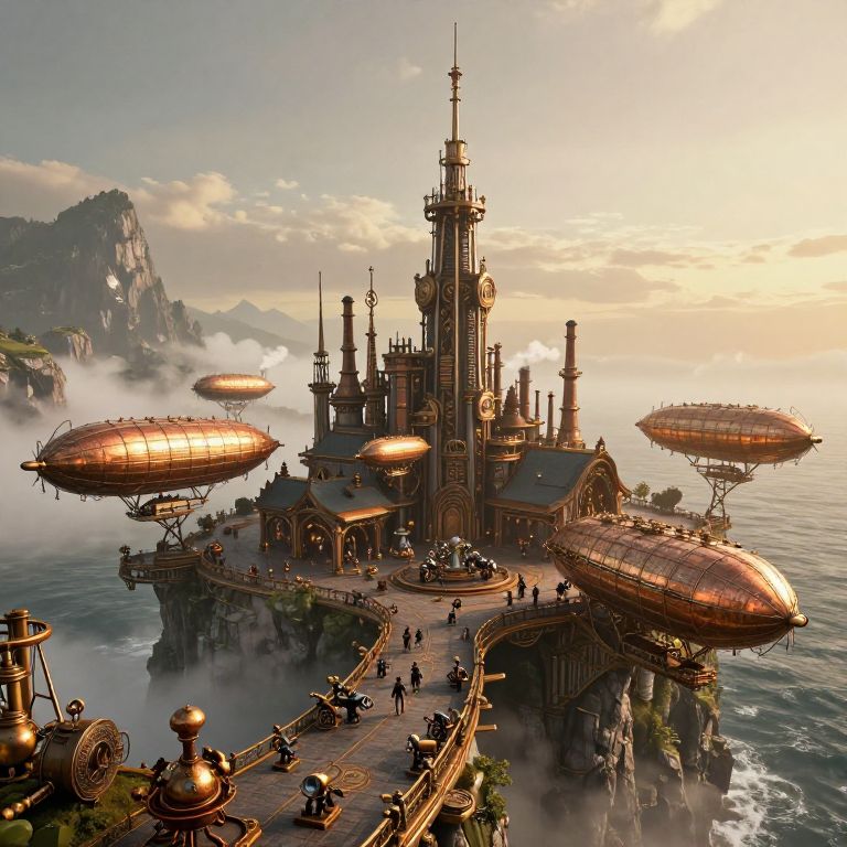 Steampunk island landscape dominated by rusted clock towers and mechanical wildlife, dense mist revealing hidden gears among exotic plants, golden hour ambiance