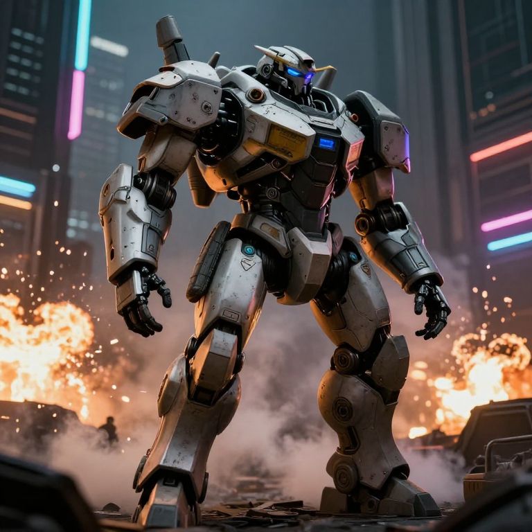 Larc-v armored tactical mech in an urban battlefield, detailed mechanical joints and armored plating, smoke and sparks from nearby explosions with neon city lights in background, gritty cyberpunk aesthetic, high contrast chiaroscuro lighting