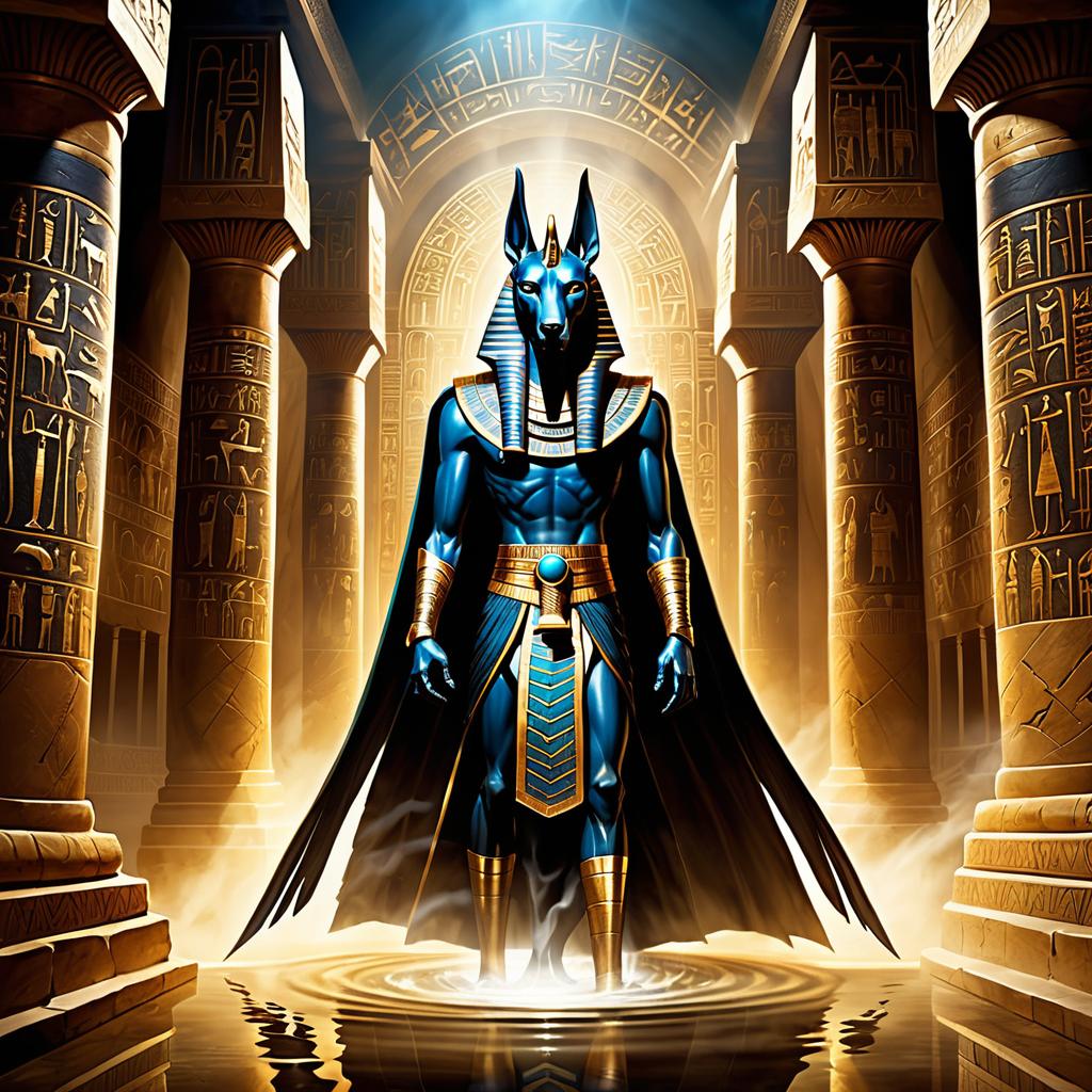 A striking statue of Anubis, the ancient Egyptian god of mummification and the dead, depicted with a human body and a jackal head. The figure is adorned with traditional Egyptian attire in black, gold, and blue, standing in a grand stone temple hallway with large columns engraved with hieroglyphs. Dramatic lighting and atmospheric mist create a mysterious and solemn ambiance.