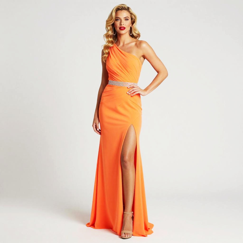 Photorealistic image of a blonde woman standing outdoors in sunlight wearing a long, flowing yellow evening gown. The woman has long hair and is posing with one hand on her hip. The setting includes stone pavement and a stone wall with greenery in the background.