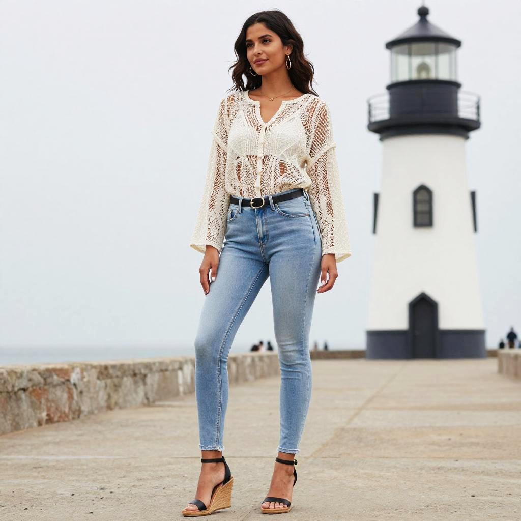 A woman, in a casual boho style with a sheer ivory crochet top and light wash skinny jeans, standing on a pier with a lighthouse in the background, embodying the vibrant visual style of image comics. She wears black strappy wedge sandals and a thin leather belt, with natural makeup and wavy loose hair. Sexy. Pretty face and beutiful eyes