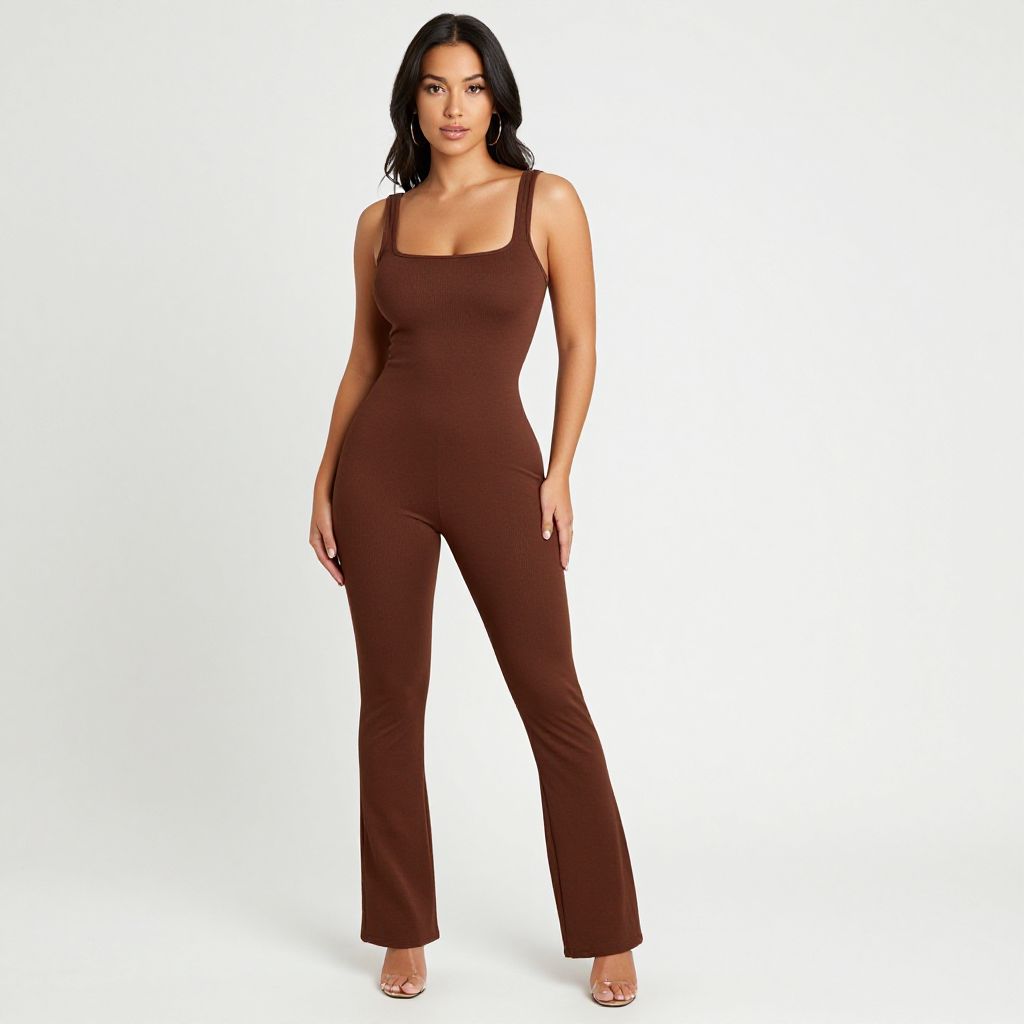 "Woman, contemporary, form-fitting ribbed jumpsuit in rich brown, square neckline, thin straps, full-length pants, clear high-heeled sandals, minimal accessories, white seamless background. Sexy. Pretty face and beаutiful eyes. Big breasts."