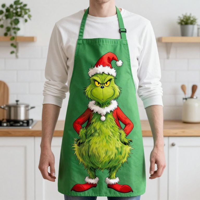 The whimsical apron features a vibrant, anthropomorphic Grinch character adorned in festive holiday attire, blending the fantastical charm of a beloved literary figure with the playful absurdity of kitchen wear.