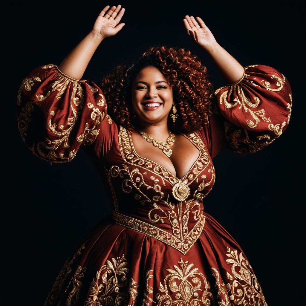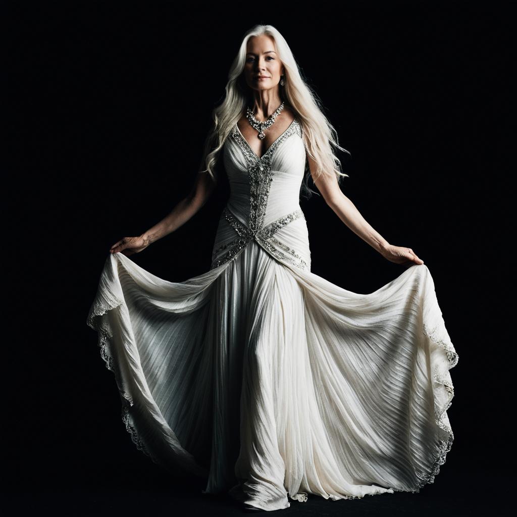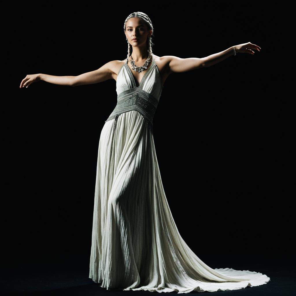 Digital artwork of a young woman with alabaster skin and long emerald green hair, wearing a flowing emerald and white dress with intricate details and a delicate necklace. She stands gracefully with a serene expression against a black background, her elegant posture emphasized by the flowing fabric extending from her sleeves.