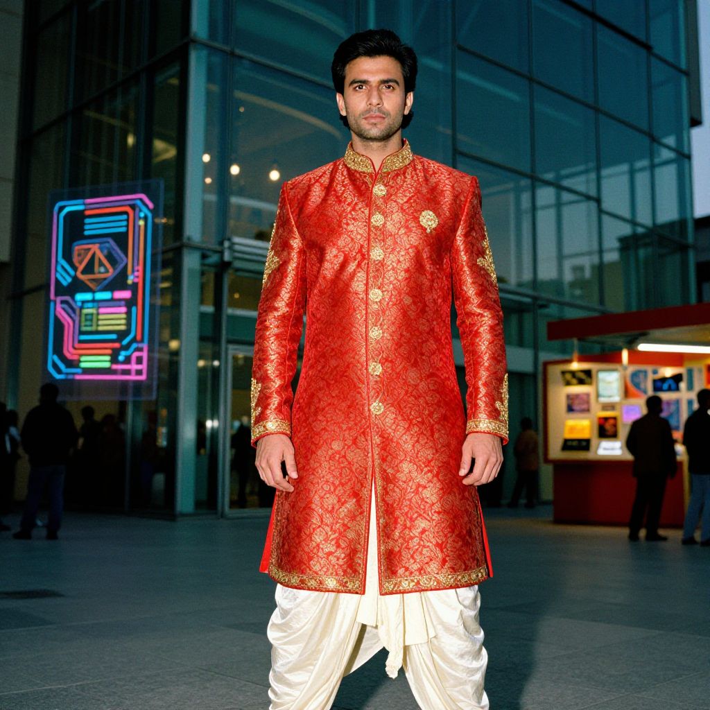 Photograph of a bearded man in a vibrant red, gold-embroidered traditional Indian kurta with white pants, standing in a modern,