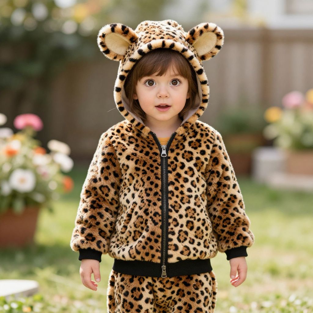 A young child wearing a vibrant leopard print outfit with a hooded jacket and detailed ear-shaped accents, the fur pattern clearly visible on the sleeves, pants, and hood. The child has large, curious eyes and a playful expression, standing in a sunny backyard with soft grass and blooming flowers in the background. The overall atmosphere is whimsical and colorful, blending fantasy with a touch of realism.