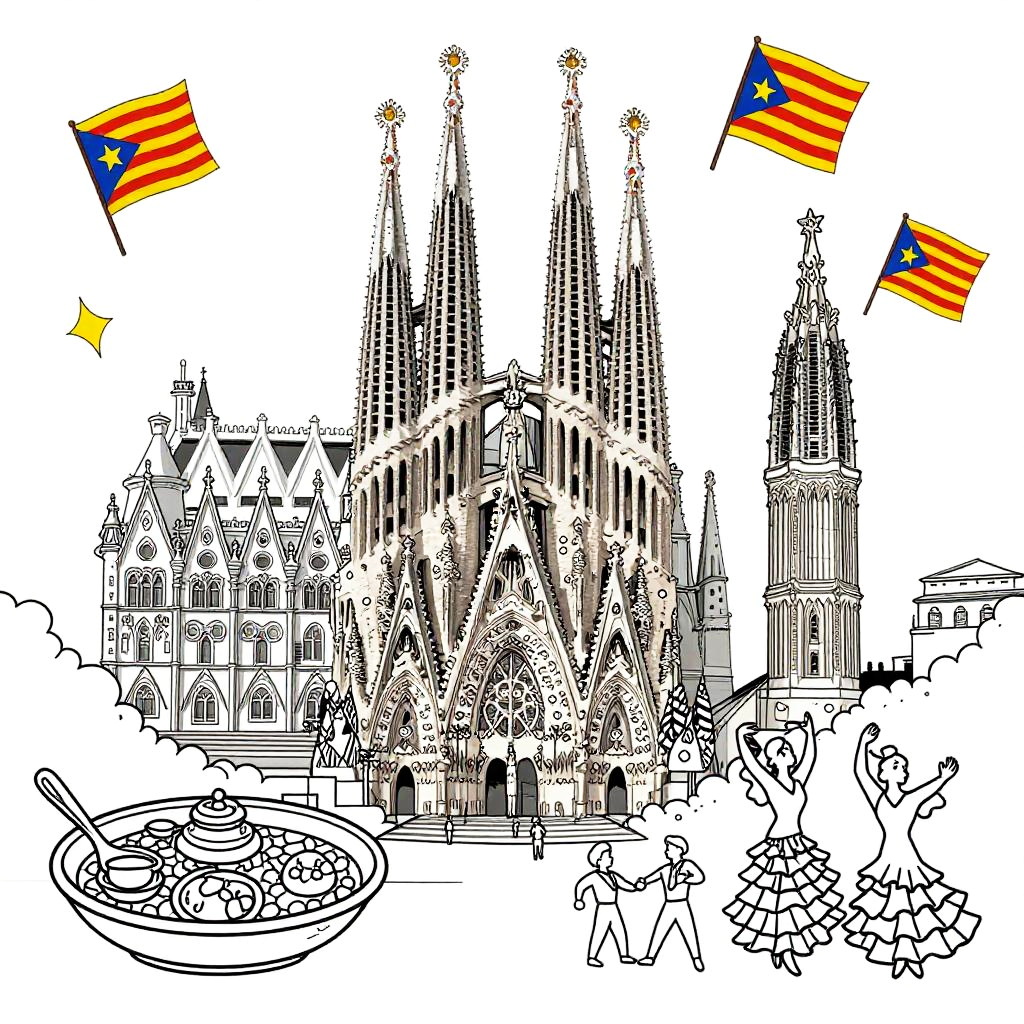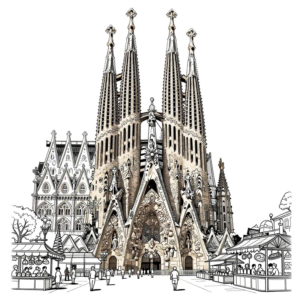 Barcelona coloring page featuring iconic landmarks like Sagrada Familia and Park Güell, detailed outlines with artistic patterns, street scenes with lively markets and tapas bars, inviting creativity through intricate designs, playful and educational style.