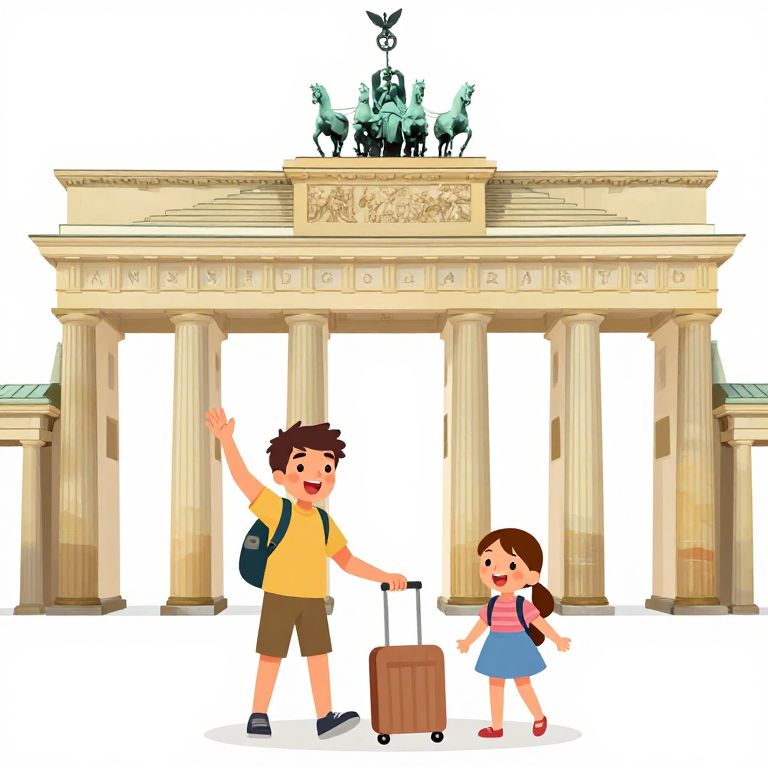 Over-The-Top illustration of family with boy and girl, traveling, germany, brandenburger tor, happy, excited, clean, simple, square format,