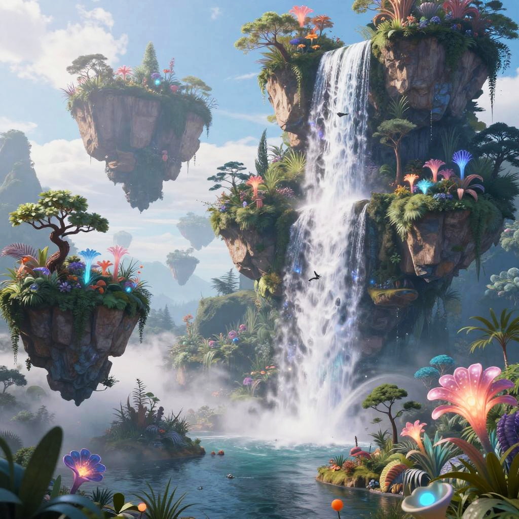 Vibrant digital fantasy landscape with floating islands, towering waterfall, colorful exotic flowers, lush greenery, and a bright blue sky.