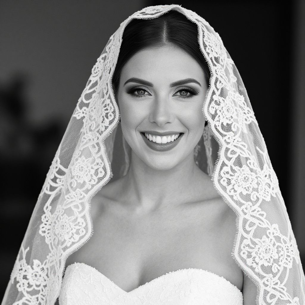 Black-and-white photo of a smiling bride with dark hair, wearing an intricate lace veil and strapless wedding dress. Her eyes are bright and she has a radiant smile. The veil has delicate floral patterns and frames her face. The background is blurred, keeping the focus on her. The image has a soft, elegant feel with high contrast and sharp details.