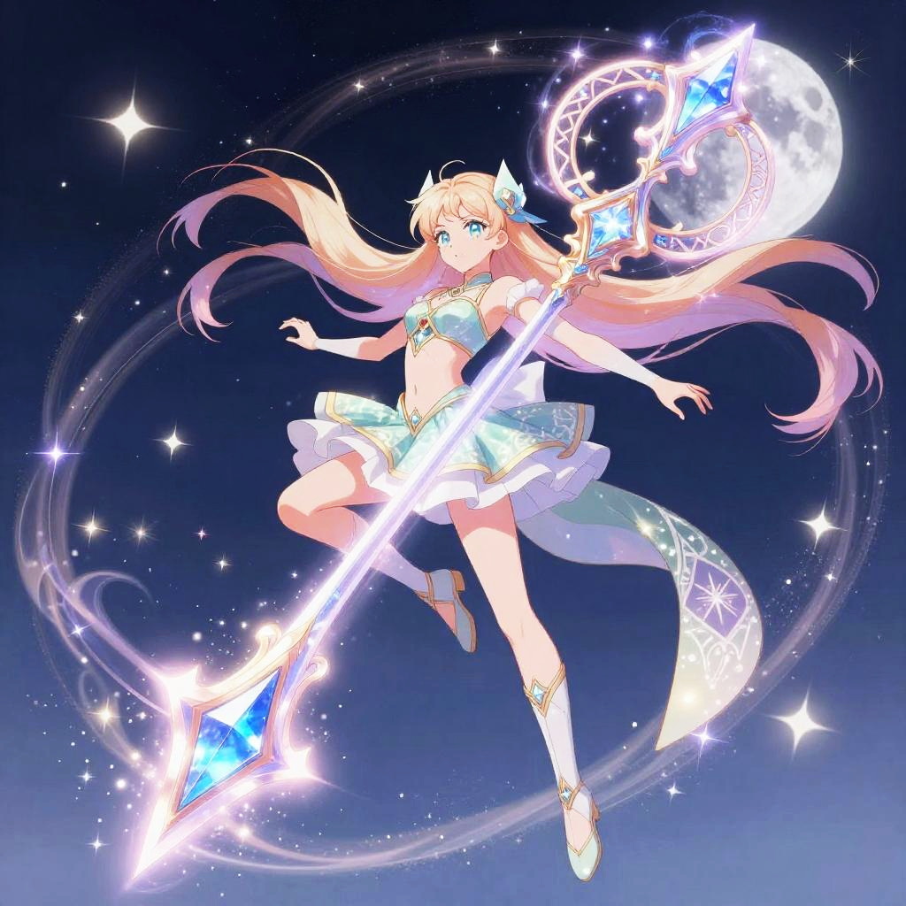 Magical girl weapon as a sleek shining sword adorned with glowing runes, emitting a fiery aura, intense magical energy swirling around the blade, neon pastel colors, character holding it ready for battle atop a crystalline mountain under a cosmic sky.