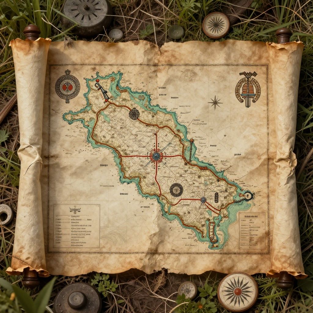 Primordial nationalism represented by an aged scroll map with sacred tribal emblems and weathered artifacts surrounded by wild nature, symbolizing origins and eternal homeland, detailed and textured