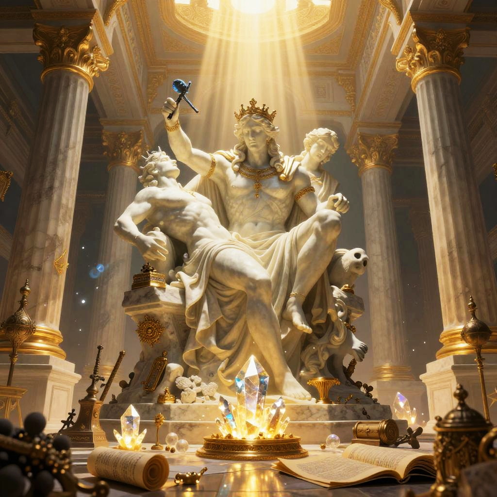 A Greek god maker sculpting mythical beings in a grand workshop filled with glowing crystals, ancient scrolls and mystical artifacts scattered around, golden rays streaming through tall marble pillars, enigmatic expression, high fantasy illustration