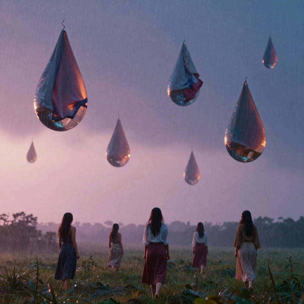 Digital artwork of 13 ethereal women in flowing dresses standing on a floating platform surrounded by colorful, wavy lights, under a full moon in a