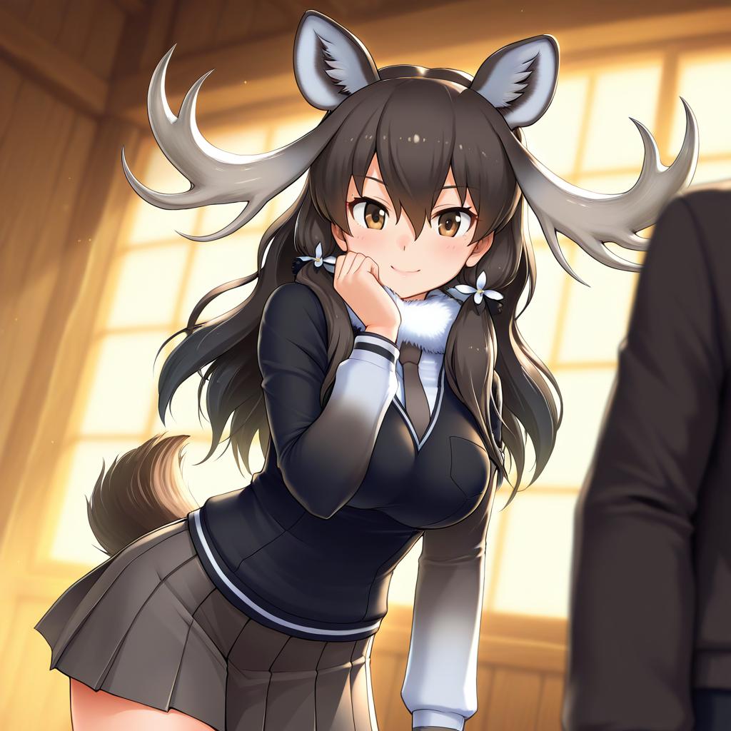 Moose (kemono friends), kemono friends, 1girl, moose ears, extra ears, horns, moose tail, brown eyes, hair between eyes, long hair, brown hair, black hair, pleated skirt, long sleeves, antlers, by artist ebizome, illustrious