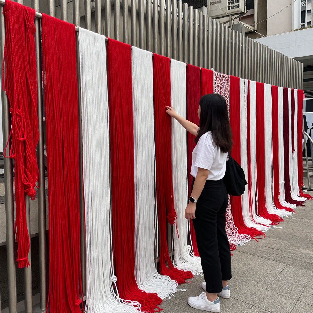 Photograph of a young Asian woman with long black hair, wearing a white t-shirt, black pants, and white sneakers, standing in front of a series of vertical metal poles adorned with vibrant red and white fringed fabrics. She touches one of the red fabrics with her right hand while holding a black bag in her left. The background includes urban buildings and a white tent. The red and white fabrics create a striking, repetitive pattern against the grey poles and pavement. The image has a high contrast and vibrant color palette.