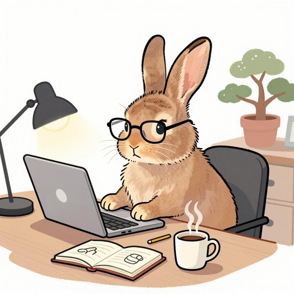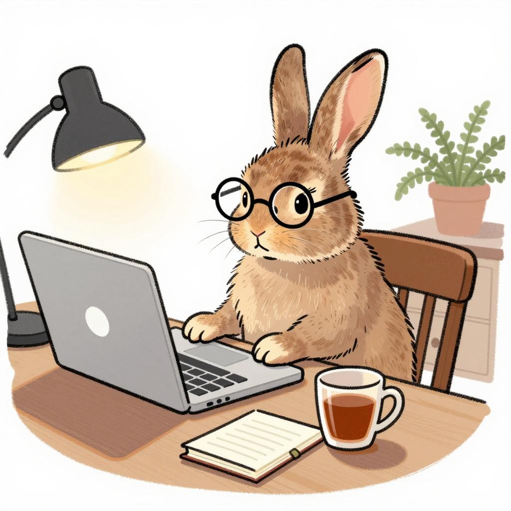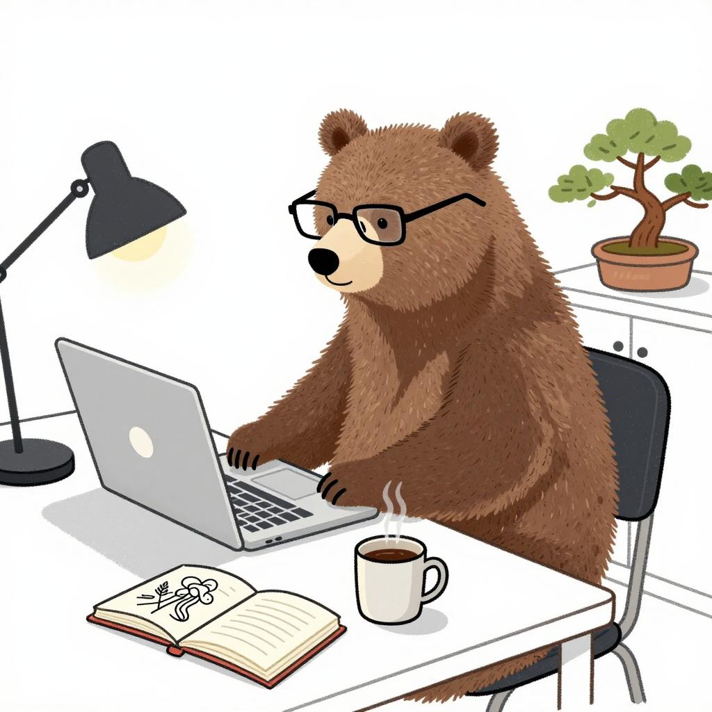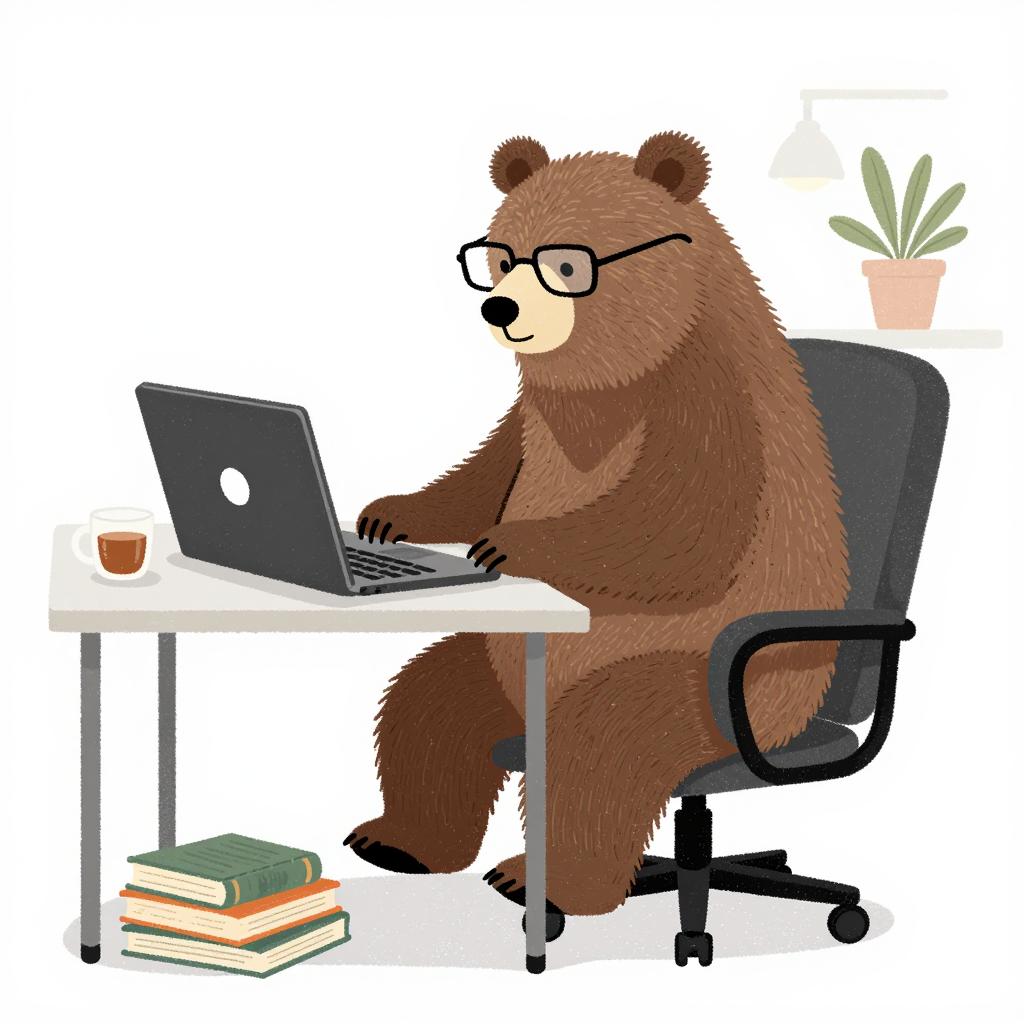 Urban Sketching Draw an illustration of a bear wearing glasses, sitting on a chair in front of a laptop. The bear should be positioned as if it is working on the laptop, typing or reading something on the screen. The environment should suggest a comfortable and cozy workspace, perhaps with a lamp or a potted plant in the background. The bear should have a calm and focused expression on its face, conveying a sense of determination and concentration. Use your creativity to add unique details that make the illustration stand out, such as books or papers scattered around the workspace, or a mug of coffee or tea on the desk.