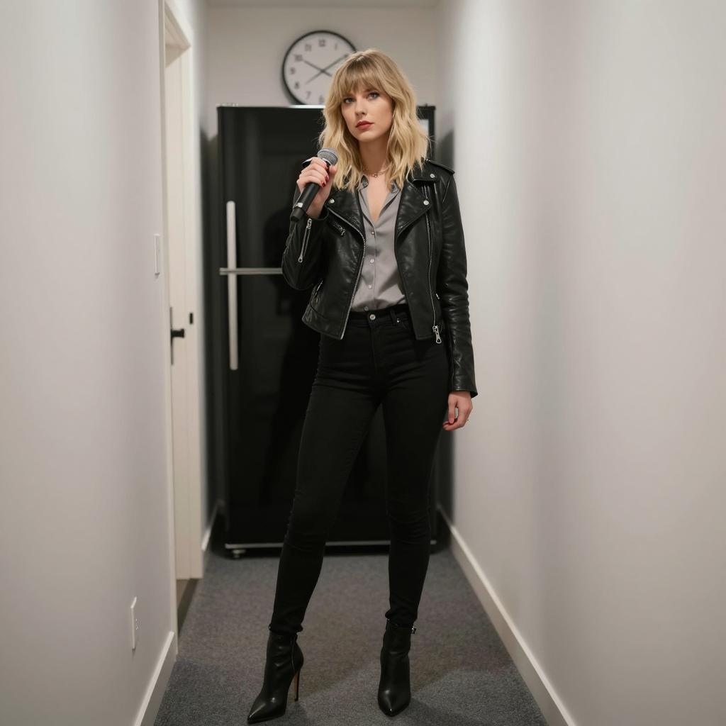 One more time pop singer, photograph of a woman standing in a narrow hallway, holding a microphone in her right hand, wearing a black leather jacket, gray shirt, black skinny pants, and black high-heeled ankle boots, blonde hair with bangs, serious expression, black refrigerator in background, clock on top of refrigerator, gray carpet, white walls, realistic style, soft lighting, casual yet confident outfit, slight shadows, modern setting, medium shot, centered composition