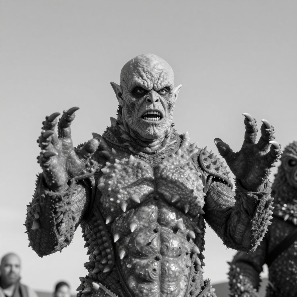 Black-and-white photograph of a person in a detailed monster costume. The costume has a ured, scaly chest, clawed hands raised, and a bald, wrinkled face with intense eyes and a wide mouth. Clear sky background, partial view of another creature on the right.