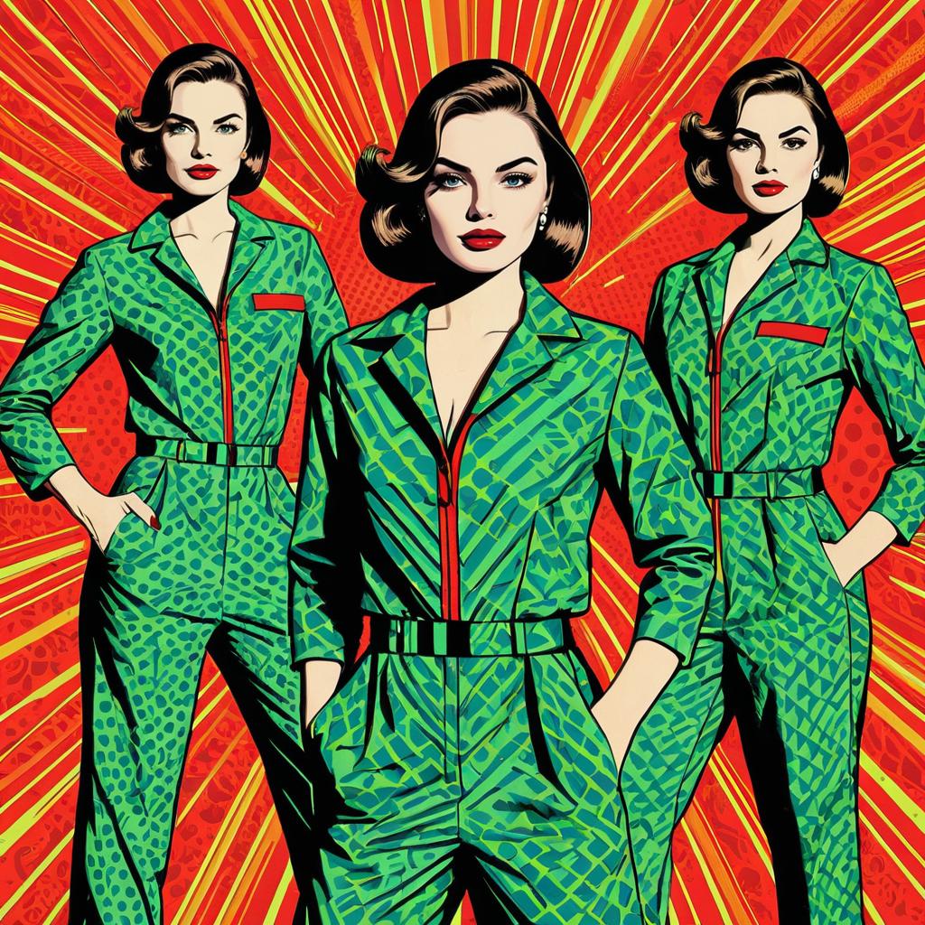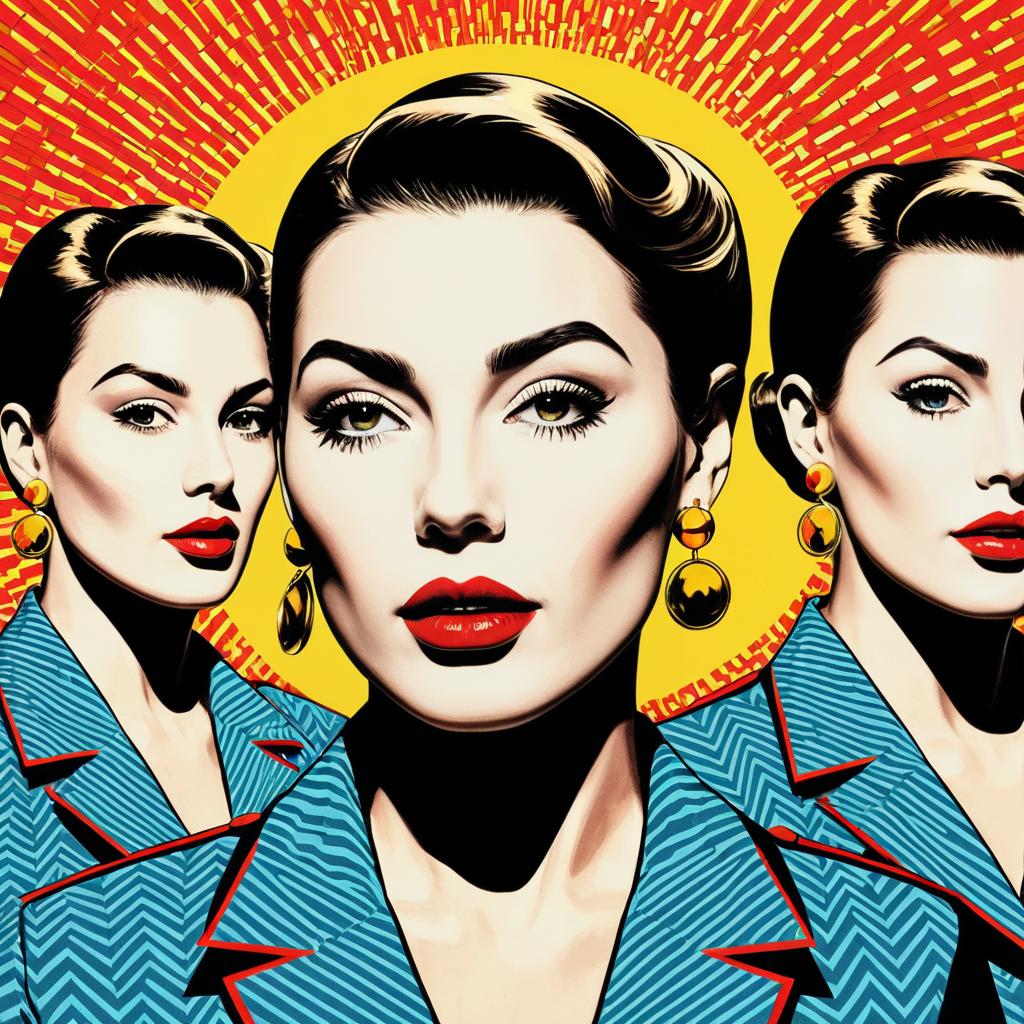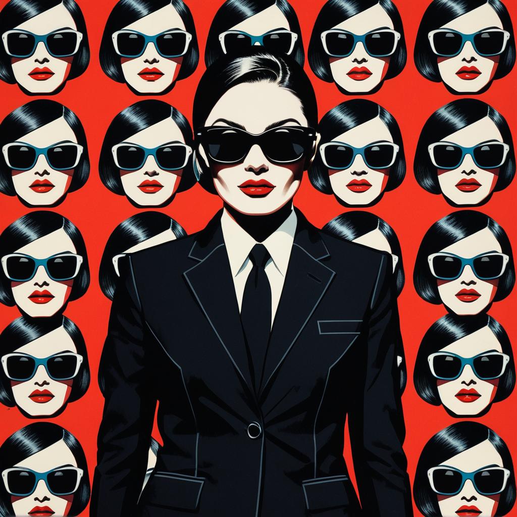 Woman with bright red lips and narrow green eyes in a modern pop art print illustration style, featuring multiple repeated prints. Very bright colors, geometric forms, and a 1960s spy movie action pose in 2D, capturing a dynamic and iconic pop art look.