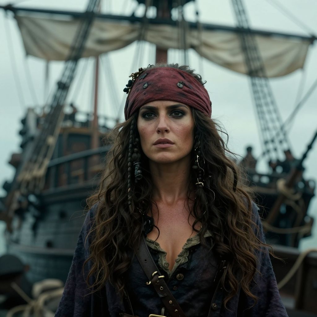 DEN_mia_khalifa, ((salty sea wench:1.2), (pirate:1.1) on a (dilapidated pirate ship:1.2), (buccaneer:1.2), pirate, (pirate ship:1.1), atmospheric, (rigging:1.2), (mast:1.1), ship:1.2), bokeh, f1.4, 40mm, photorealistic, raw, 8k, textured skin, skin pores