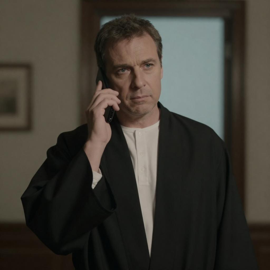 Photograph of a middle-aged man with short brown hair, wearing a black robe over a white shirt, holding a phone to his ear. He has a serious, focused expression. Background includes a dimly lit room with a door and light blue glow. The man is centered, facing slightly to the right.
