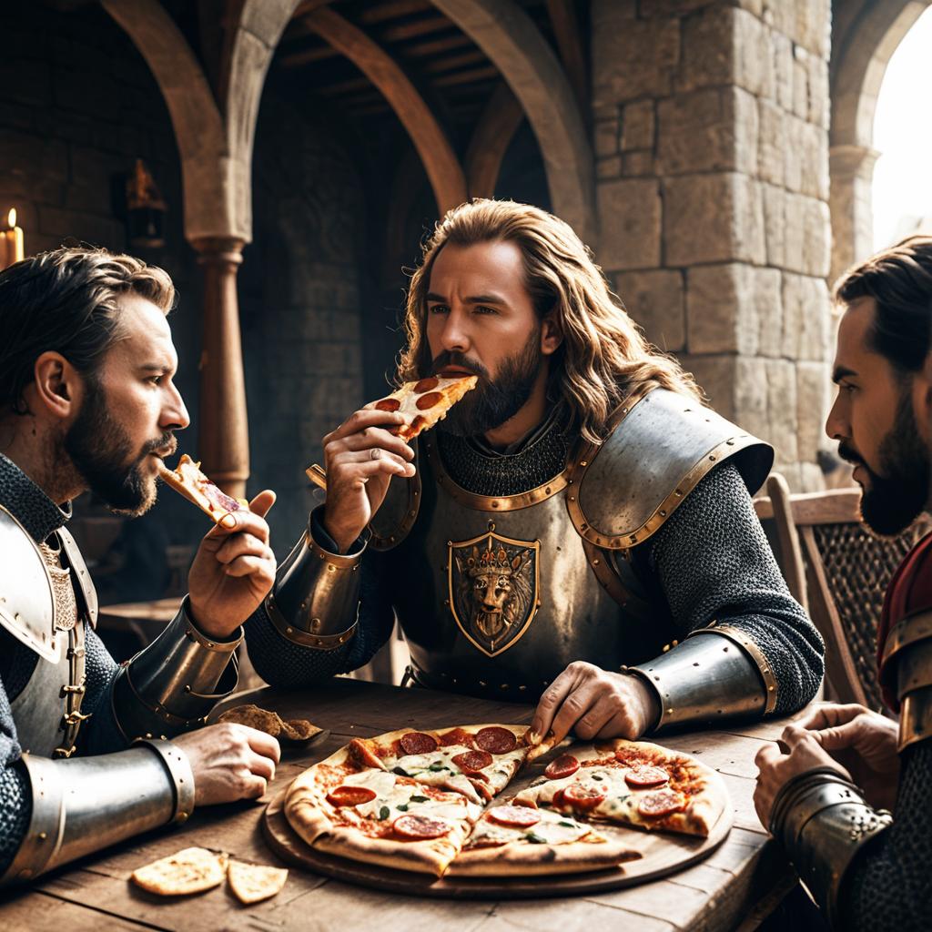 A group of middle-aged men with varied hairstyles and facial hair are sitting around a wooden round table enjoying large pepperoni pizzas in a warm, dimly lit restaurant setting. The men are dressed in semi-formal attire, including jackets and ties, and appear engaged in casual dining with a relaxed atmosphere. The background features brick walls and soft lighting, enhancing the cozy ambiance of the scene.