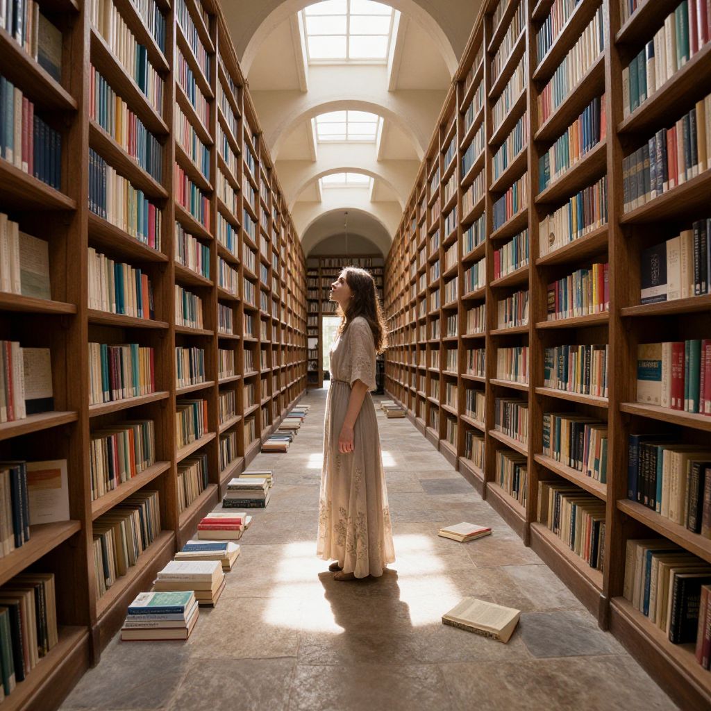 Ethereal library corridor stretches endlessly, flanked by towering wooden shelves brimming with colorful books, while a solitary woman in a flowing dress stands contemplatively amidst scattered volumes on the stone floor, sunlight filtering through arched skylights above.