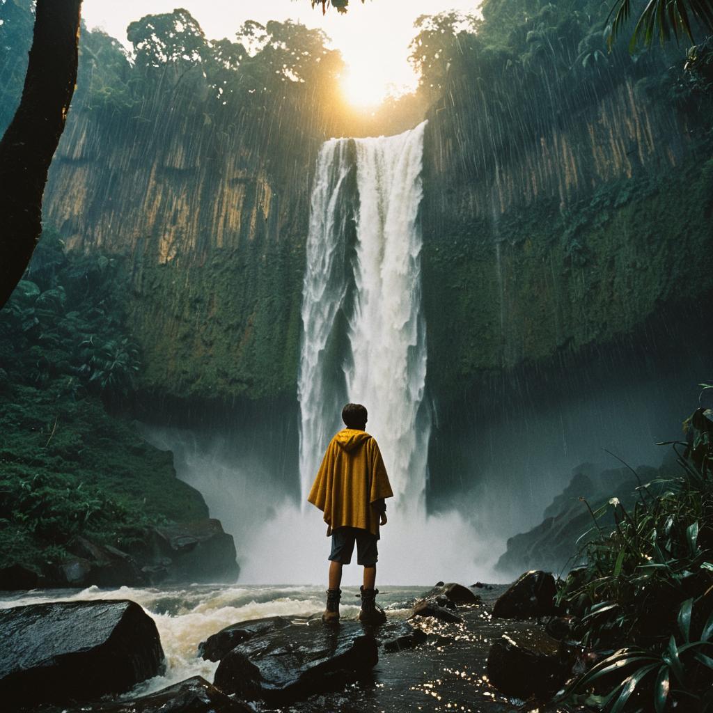 Child Walking Among Marching Penguins on Icy Terrain