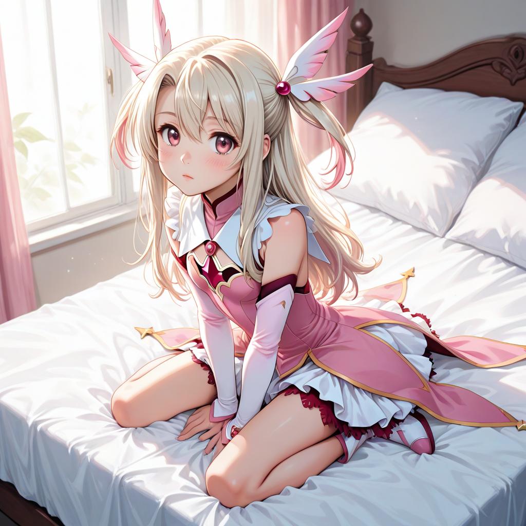 Masterpiece, best quality, high resolution, 1girl, solo, PrismaIllya, Magical Girl Default, sitting, on bed