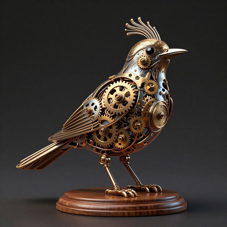 A steampunk-inspired 3D render of a clockwork oriole, intricately crafted from finely oiled cogs and gears, stands poised on a wooden pedestal, its mechanical body gleaming under dramatic lighting as it prepares to sing symphonies of mechanical whirs and harmonic chimes.