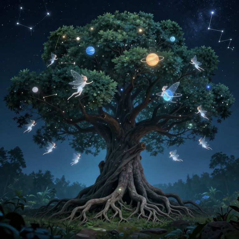 A mesmerizing digital artwork portraying an immense, ancient tree with its roots delving deep into a magical forest floor, spreading its branches across the tranquil night sky adorned with twinkling constellations. Emanating from the foliage are delicate, fairy-like beings, each designed to resemble celestial bodies such as planets and stars. These whimsical creatures gracefully dance around the awe-inspiring tree, their ethereal movements reflecting the soft luminescence of stardust that permeates the atmosphere. This enchanting scene encapsulates both the serenity of nature and the boundless enigmas of the cosmos, inviting viewers to marvel at the delicate equilibrium between these two seemingly distinct realms.