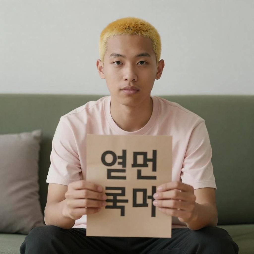 Portrait of a young Asian man with short yellow dyed hair, light brown skin, wearing a pink t-shirt and black pants, sitting on a green couch. He holds a brown paper with bold black Korean text, against a minimalistic background with a grey wall and a grey pillow.