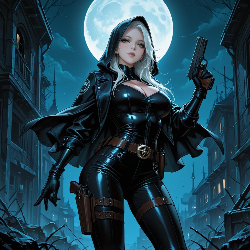 1girl, breasts, hood, solo, black lips, weapon, cleavage, gun, white hair, gloves, moon, hood up, handgun, large breasts, night, cleavage cutout, makeup, western comics (style), holster, holding, black gloves, full moon, belt, clothing cutout, lipstick